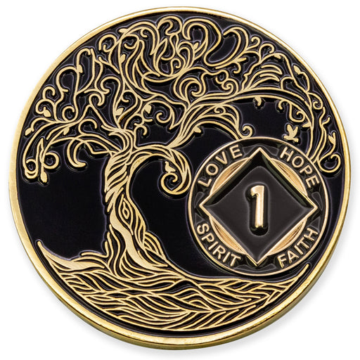 View full details1 Year Sobriety Mint Twisted Tree of Life Gold Plated NA Recovery Medallion - One Year Chip/Coin - Black