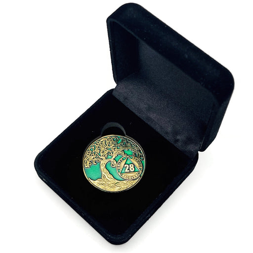 View full details28 Year Sobriety Mint Twisted Tree of Life Gold Plated AA Recovery Medallion - Twenty-Eight Year Chip/Coin - Black + Velvet Case