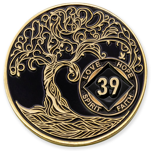 View full details39 Year Sobriety Mint Twisted Tree of Life Gold Plated AA Recovery Medallion - Thirty-Nine Year Chip/Coin - Black