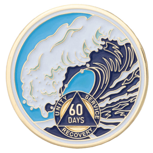 View full details60 Days Sobriety Mint Crashing Wave Gold Plated AA Recovery Medallion - Two Month Chip/Coin - Blue/White