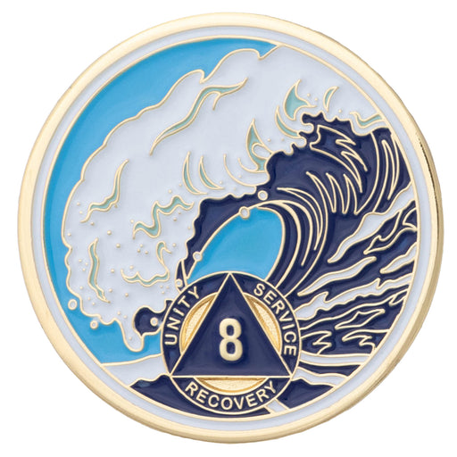 View full details8 Year Sobriety Mint Crashing Wave Gold Plated AA Recovery Medallion - Eight Year Chip/Coin - Blue/White