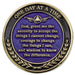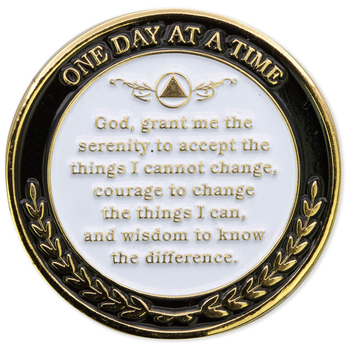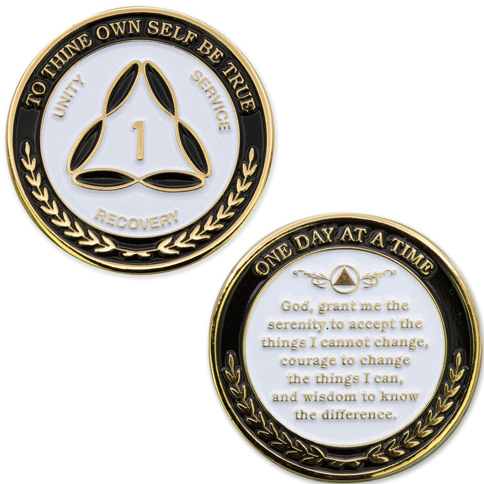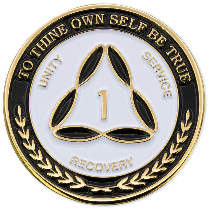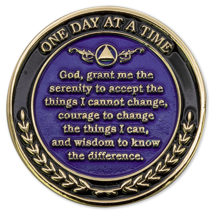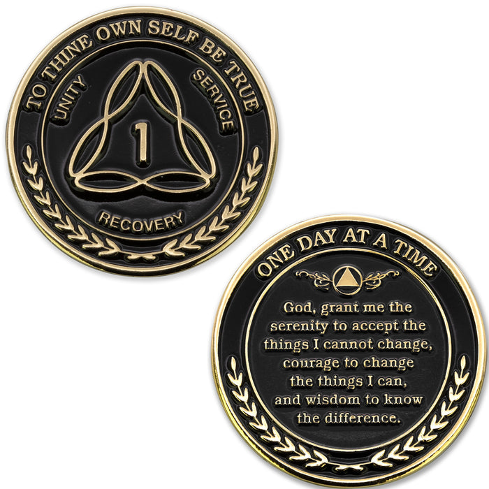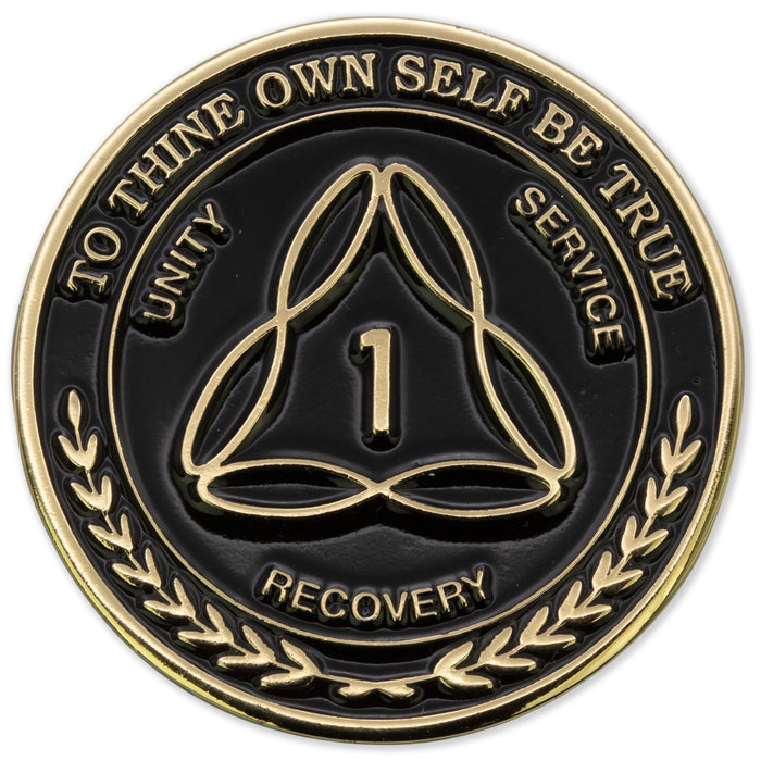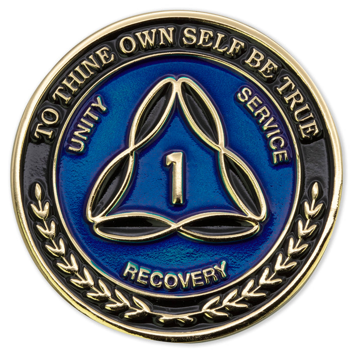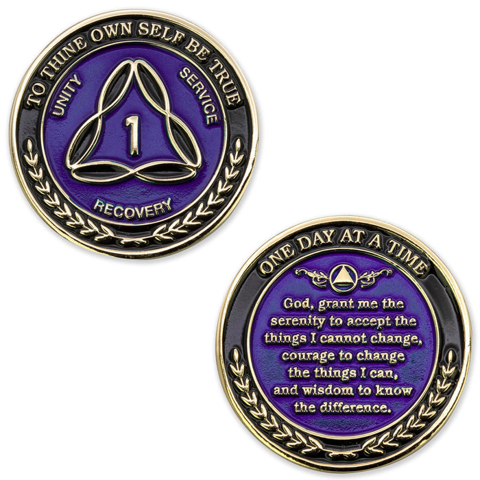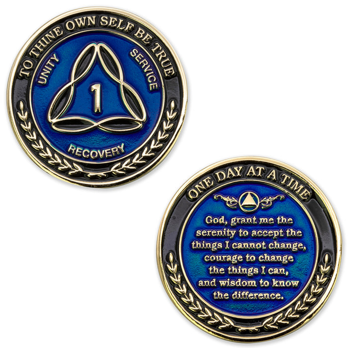 Gold-plated and elegantly designed, this keepsake embodies resilience and progress. The front showcases a unique triangle formed by three infinity symbols, symbolizing continuity and balance, along with the words "Unity, Service, Recovery" and the empowering phrase "To Thine Own Self Be True." On the back, you'll find "One Day at a Time" paired with the AA Serenity Prayer, a source of daily strength. Available in a vibrant range of colors, this coin is a heartfelt way to honor your milestone.