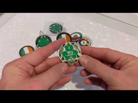 Privately minted Shamrock-themed Specialty Green/White/Orange AA/NA Medallion (available in years 1 to 50). This coin was designed to be a fresh, unique alternative to traditional recovery chips found in meeting rooms. It was made to be bigger, heavier, and easier to read.